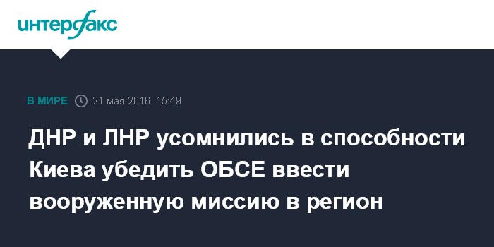 Москва. 21 мая. INTERFAX.RU - В руководстве самопровозглашенных республик Донбасса высказали сомнения, что Украина сможет убедить ОБСЕ ввести в регион вооруженную миссию.