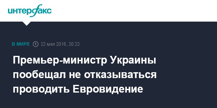 "Ни в коем случае (Украина не откажется от проведения конкурса "Евровидение"- ИФ). Я считаю, что это для нас большая честь... И мы должны приложить максимум усилий, чтобы провести "Евровидение" на высоком, профессиональном уровне", - сказал В.Гройсман в комментарии телеканалу "1+1", который был показан в эфире в воскресенье.