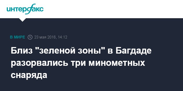 Москва. 23 мая. INTERFAX.RU - Три минометных снаряда разорвались близ тщательно охраняемой "зеленой зоны" в Багдаде, сообщили в понедельник западные СМИ со ссылкой на власти Ирака.