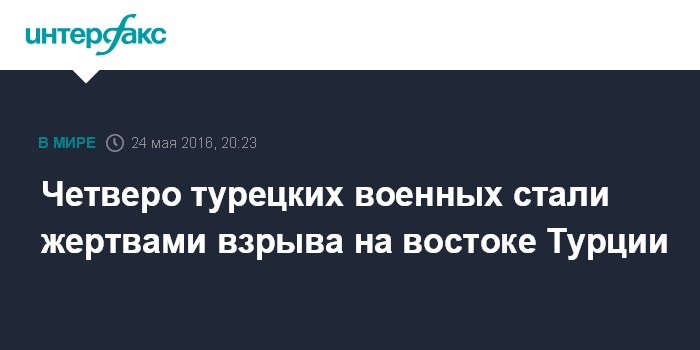 Москва. 24 мая. INTERFAX.RU - Четверо турецких военнослужащих погибли в результате взрыва бомбы, заложенной на обочине дороги в провинции Ван на востоке Турции, сообщает во вторник турецкое издание Hurriyet.