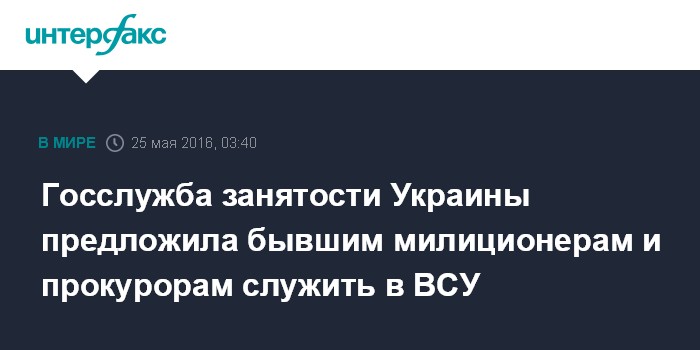 Москва. 25 мая. INTERFAX.RU - На Украине уволенным с работы сотрудникам министерства внутренних дел, государственной фискальной службы и прокуратуры государственная служба занятости рекомендует обратить внимание на прохождение военной службы по контракту в Вооруженных силах Украины.