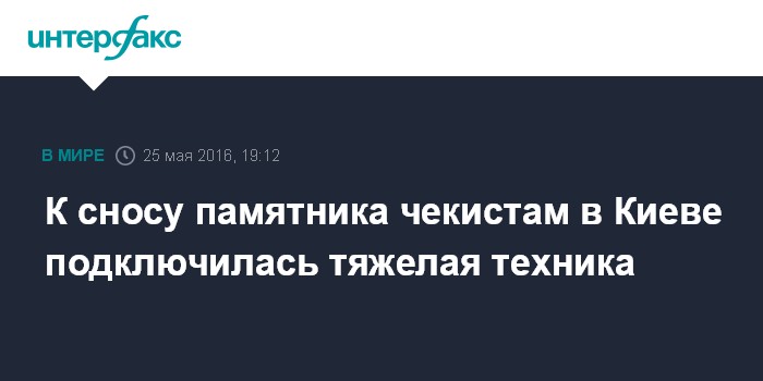 Москва. 25 мая. INTERFAX.RU - В Киеве возле станции метро "Лыбедская" в среду продолжается снос памятника чекистам. Как передает корреспондент агентства "Интерфакс", уже отломаны тяжелые гранитные плиты. Сейчас тяжелая техника отбойным молотом разрушает бетонное основание по периметру памятника, а также бетонную сердцевину.