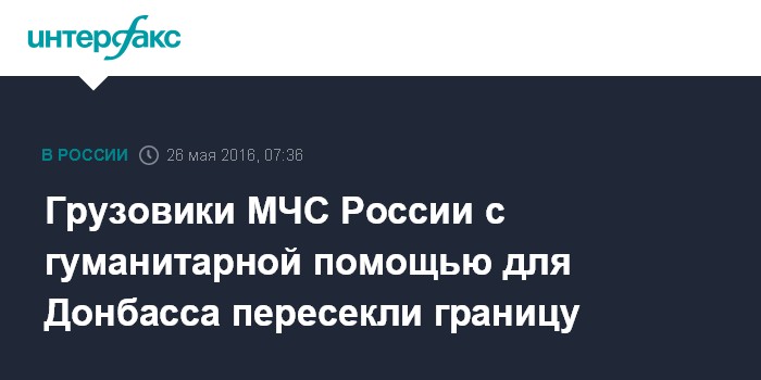 Москва. 26 мая. INTERFAX.RU - Все автомобили из состава 52-й колонны МЧС России с гуманитарной помощью для Донбасса пересекли российско-украинскую границу, сообщили в МЧС России.