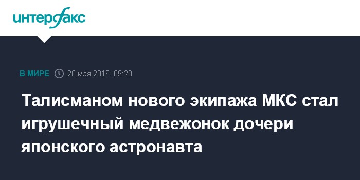 Москва. 26 мая. INTERFAX.RU - Талисманом нового экипажа Международной космической станции, который отправится к МКС 24 июня, станет игрушечный медвежонок из Японии, заявил журналистам перед началом комплексных и экзаменационных тренировок бортинженер, японский астронавт JAXA Ониши Такуя.