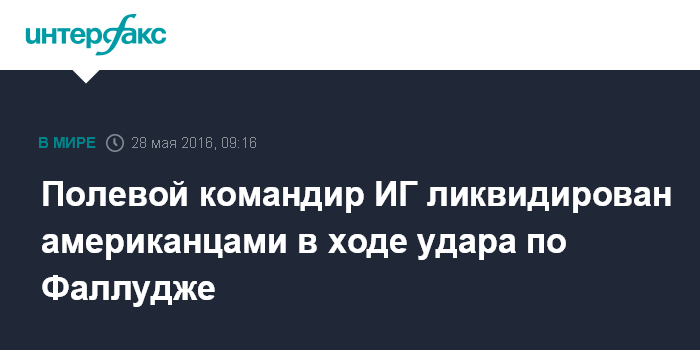 Москва. 28 мая. INTERFAX.RU - Один из полевых командиров "Исламского государства" (группировка запрещена в России) был ликвидирован в результате авиаудара силами США по позициям боевиков в Ираке близ Фаллуджы.