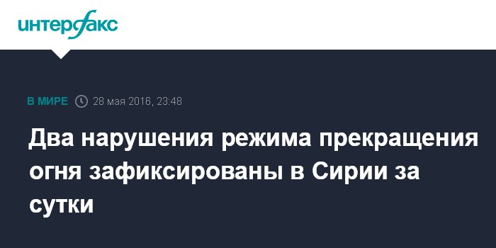Москва. 28 мая. INTERFAX.RU - За минувшие сутки в Сирии зафиксированы два нарушения режима прекращения огня в провинции Дамаск , сообщили в министерстве обороны России.