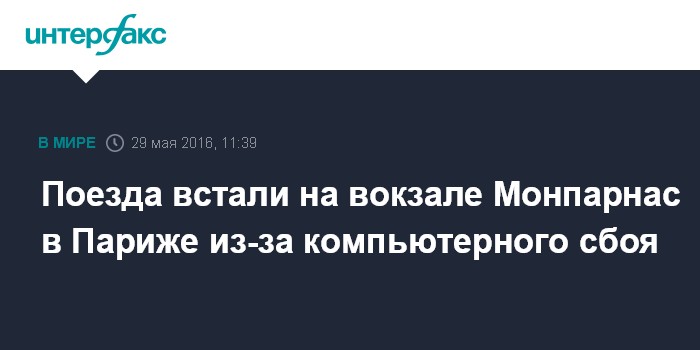 Москва. 29 мая. INTERFAX.RU - Движение поездов на вокзале Монпарнас в Париже полностью остановилось из-за сбоя в работе компьютерной системы, сообщает в воскресенье сайт газеты Le Figaro.