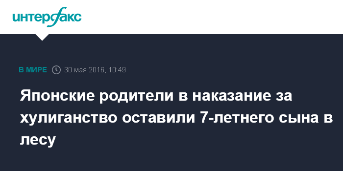 Москва. 30 мая. INTERFAX.RU - В Японии родители семилетнего мальчика признались, что их сын не заблудился в лесу в горах, как они заявляли ранее, а они намеренно оставили его там, сообщает The Japan Times. Ребенок все еще не найден.