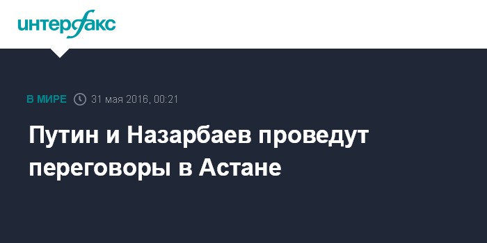 Москва. 31 мая. INTERFAX.RU - Президент РФ Владимир Путин во вторник на полях саммита Высшего Евразийского экономического совета проведет встречу с коллегой из Казахстана Нурсултаном Назарбаевым. Как сообщил накануне помощник российского президента Юрий Ушаков, в ходе переговоров планируется обсудить состояние и перспективы двустороннего сотрудничества, некоторые международные вопросы, а также тему взаимодействия в рамках интеграционных объединений на постсоветском пространстве, особенно с учетом того, что Казахстан в настоящий момент шефствует в ЕАЭС.