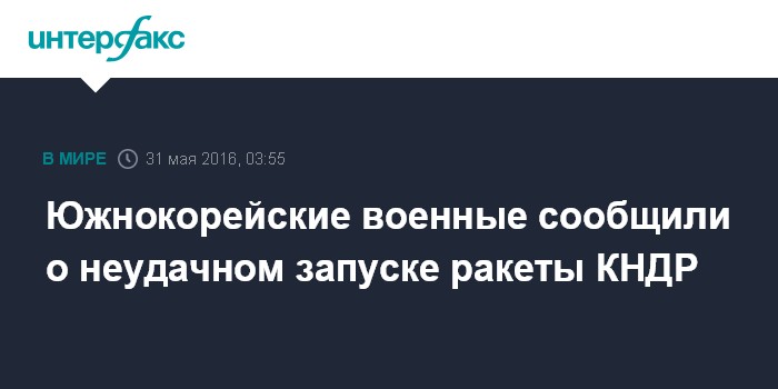 Москва. 31 мая. INTERFAX.RU - Северная Корея попыталась запустить ракету с восточного побережья ранним утром во вторник. Запуск по-видимому, не удался, передает южнокорейское агентство Йонхап со ссылкой на Объединенный комитет начальников штабов Южной Кореи (JCS).