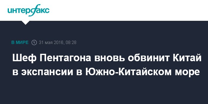 Москва. 31 мая. INTERFAX.RU - Министр обороны США Эштон Картер, который во вторник отбывает в Сингапур на азиатскую конференцию по безопасности, обратит внимание на политику Китая в Южно-Китайском море, обвинив его в экспансионизме, сообщают американские СМИ.