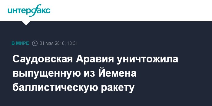 Москва. 31 мая. INTERFAX.RU - В Саудовской Аравии перехвачена и ликвидирована баллистическая ракета, выпущенная с территории Йемена, сообщила во вторник газета The Jerusalem Post.