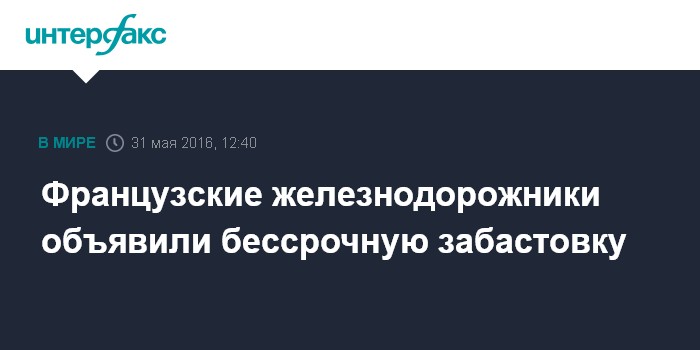 Москва. 31 мая. INTERFAX.RU - Сотрудники железнодорожной компании SNCF начнут во вторник вечером бессрочную забастовку против реформы трудового законодательства, сообщают французские СМИ.