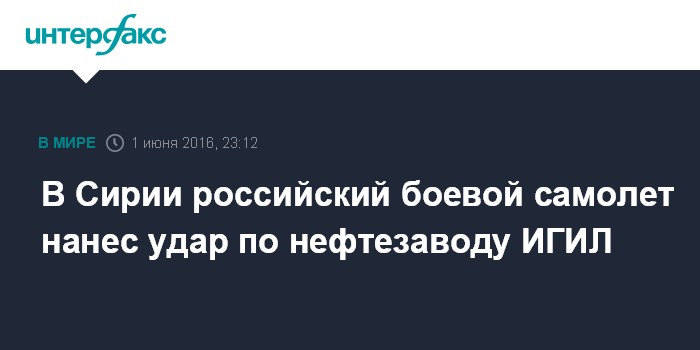"Самолётом Су-34 нанесен удар по нефтеперерабатывающему заводу, расположенному на территории, подконтрольной ИГИЛ, в районе населенного пункта Рас-эль-Айн, провинции Хасеке", - говорится в бюллетене российского центра по примирению враждующих сторон в Сирии.