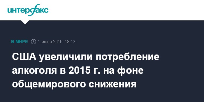Москва. 2 июня. INTERFAX.RU - Потребление алкоголя в мире в 2015 году снизилось впервые за 15 лет, однако США стали заметным исключением из общей картины, говорится в исследовании компании Euromonitor International.