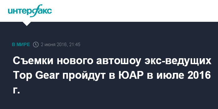 Москва. 2 июня. INTERFAX.RU - Бывшие ведущие телепередачи Top Gear Джереми Кларксон, Джеймс Мэй и Ричард Хаммонд начнут съемки нового шоу - Grand Tour - уже в июле в Йоханнесбурге.