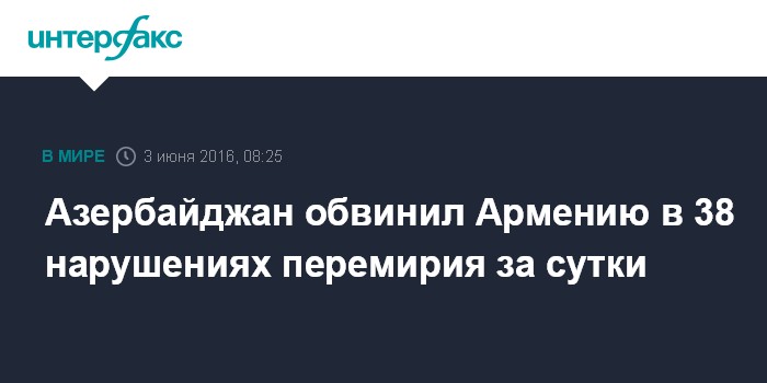 Москва. 3 июня. INTERFAX.RU - Армянские военные за минувшие сутки 38 раз нарушили режим прекращения огня на линии соприкосновения вооруженных сил в зоне карабахского конфликта, сообщает пресс-служба Министерства обороны Азербайджана.