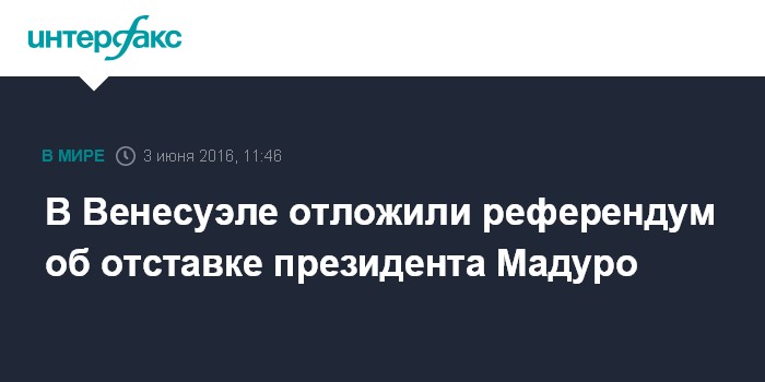 Москва. 3 июня. INTERFAX.RU - Лидеры оппозиции Венесуэлы призвали сограждан сохранять спокойствие после того, как Национальный избирательный совет отменил встречу, посвященную обсуждению вопроса о референдуме по вопросу отставки президента страны Николаса Мадуро, сообщают в пятницу западные СМИ.