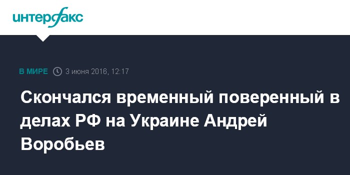 Москва. 3 июня. INTERFAX.RU - Временный поверенный в делах РФ на Украине Андрей Воробьев скоропостижно скончался 30 мая, сообщили агентству "Интерфакс" в посольстве России в Киеве в пятницу.