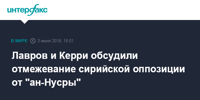 Москва. 3 июня. INTERFAX.RU - Глава МИД РФ Сергей Лавров и госсекретарь США Джон Керри обсудили необходимость срочного отмежевания умеренной сирийской оппозиции от террористической организации "Джабхат ан-Нусры" (запрещена в РФ), а также пресечение подпитки террористов из-за границы обсудили.