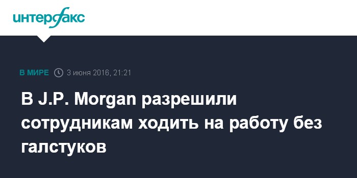 Москва. 3 июня. INTERFAX.RU - Руководство J.P. Morgan Chase & Co. решило либерализовать дресс-код в банке и разрешило сотрудникам одеваться в большинстве случаев в стиле business casual, сообщает The Wall Street Journal, которая ознакомилась с внутренним мемо банка.