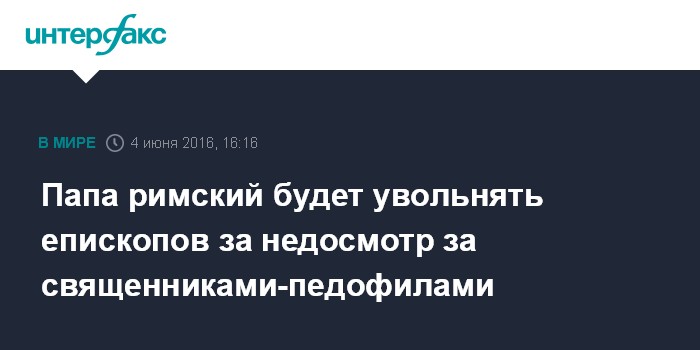 Москва. 4 июня. INTERFAX.RU - Католические епископы, которые не обращают внимания на ситуации со священниками-педофилами и не увольняют их, могут сами лишиться постов, сообщает The Guardian. Соответствующее распоряжение озвучил папа римский Франциск.