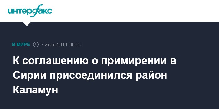 Москва. 7 июня. INTERFAX.RU - Населенный пункт Аль-Тавани, расположенный в сирийской провинции Дамаск, присоединился к соглашению о примирении и прекращении огня, сообщил представитель российского Центра по примирению враждующих сторон полковник Юрий Зраев. Подписи под соглашением, которое было заключено при посредничестве российского Центра по примирению враждующих сторон, поставили глава администрации и старейшина села, имам большой мечети в Аль-Тавани и представитель министерства примирения Сирии Яссер Саада Аллах.