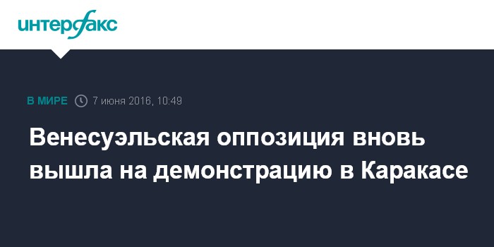 Москва. 7 июня. INTERFAX.RU - Сторонники оппозиции провели новую акцию протеста в столице Венесуэлы Каракасе, сообщают во вторник западные СМИ.