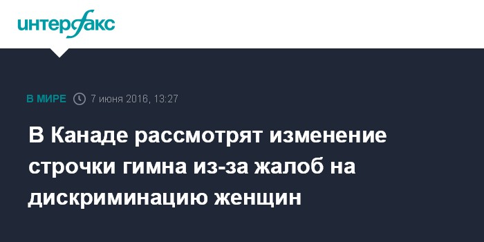 Москва. 7 июня. INTERFAX.RU - Канадские депутаты активно обсуждают возможность внесения определенных корректив в англоязычный текст гимна ради равноправия мужчин и женщин, пишут во вторник СМИ Канады.