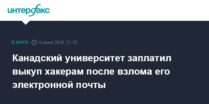 Москва. 8 июня. INTERFAX.RU - Университет канадского города Калгари заплатил крупный выкуп хакерам, чтобы вернуть контроль над внутренней системой электронной почты, сообщает в среду веб-сайт газеты Toronto Star.