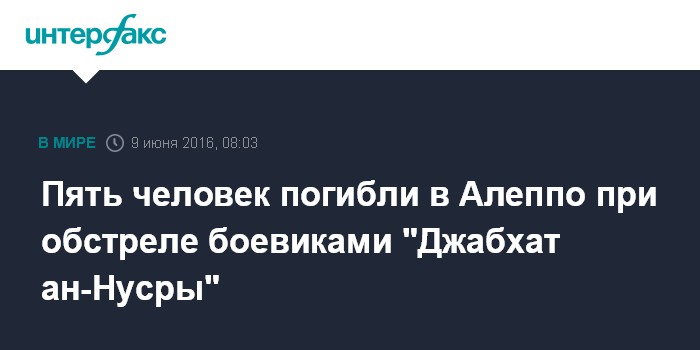 Москва. 9 июня. INTERFAX.RU - В Сирии боевики террористической группировки "Джабхат ан-Нусра" (запрещена в РФ) обстреляли газовыми баллонами, начиненными взрывчаткой, район Алеппо, пять человек погибли, более 50 получили ранения.