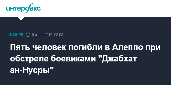 "В результате обстрела боевиками "Джабхат ан-Нусра" газовыми баллонами, начиненными взрывчаткой, рынка в районе Мейдан города Алеппо погибли 5 мирных жителей и более 50 получили ранения, повреждены около 20 жилых домов", - сообщил в четверг "Интерфаксу" представитель российского Центра по примирению враждующих сторон на территории Сирийской Арабской Республики.