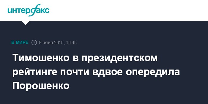 Москва. 9 июня. INTERFAX.RU - Если бы выборы президента Украины состоялись в июне 2016 года, за лидера "Батькивщины" Юлию Тимошенко проголосовали бы 13,7%, а за действующего главу государства Петра Порошенко - 7,9%.