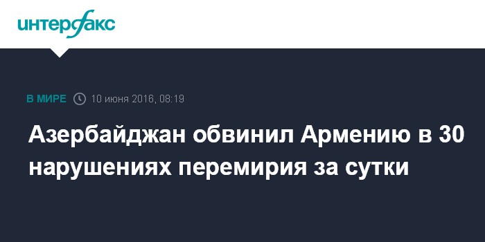 Москва. 10 июня. INTERFAX.RU - Армянские военные за минувшие сутки 30 раз нарушили режим прекращения огня на линии соприкосновения вооруженных сил, сообщает в четверг пресс-служба Министерства обороны Азербайджана.