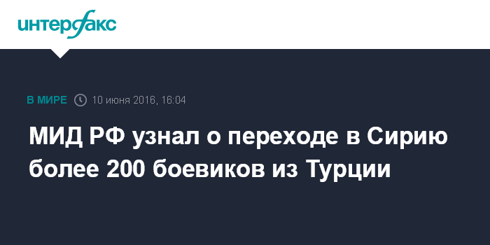 Москва. 10 июня. INTERFAX.RU - В Москве знают о переходе более 200 боевиков "Джабхат ан-Нусры" (запрещена в РФ - ИФ) с территории Турции в Сирию, заявили в пятницу в МИД России.