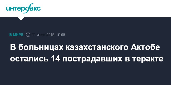 Москва. 11 июня. INTERFAX.RU - В больницах Актобе продолжают получать лечение 14 пострадавших в теракте, сообщила пресс-служба министерства здравоохранения и социального развития Казахстана.
