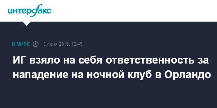 Москва. 13 июня. INTERFAX.RU - Группировка "Исламское государство" (ИГ, запрещена в России) объявила в понедельник о своей ответственности за нападение на гей-клуб в американском городе Орландо, штат Флорида, которое произошло накануне, сообщают западные СМИ.