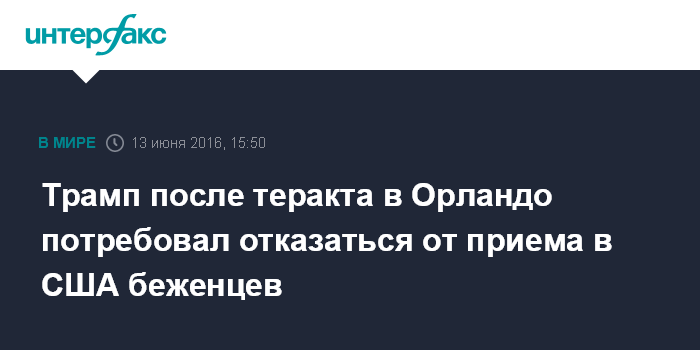 Москва. 13 июня. INTERFAX.RU - Кандидат в президенты США от республиканцев Дональд Трамп призывает прекратить прием беженцев из Сирии в связи с терактом в Орландо.