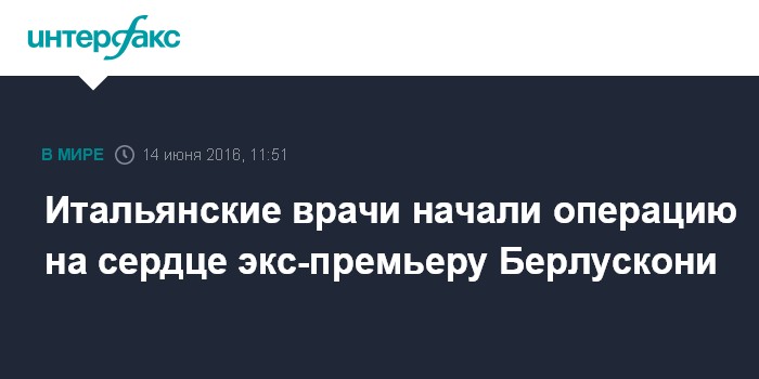 Москва. 14 июня. INTERFAX.RU - Хирурги итальянской больницы "Сан-Раффаэле" приступили к операции по замене аортального клапана бывшему премьер-министру Италии Сильвио Берлускони, говорится в сообщении, распространенном пресс-службой клиники.
