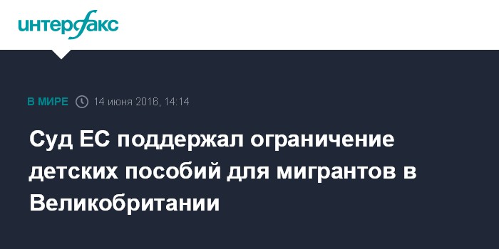 Москва. 14 июня. INTERFAX.RU - Европейский суд (высшая судебная инстанция Евросоюза) признал за Великобританией право на ограничение детских пособий для некоторых мигрантов из стран ЕС.