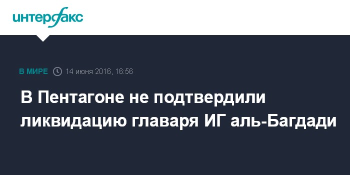 Москва. 14 июня. INTERFAX.RU - Распространенная в СМИ информация о возможной смерти главаря запрещенного в РФ "Исламского государства" Абу Бакра аль-Багдади пока не подтверждается, заявили в Пентагоне.
