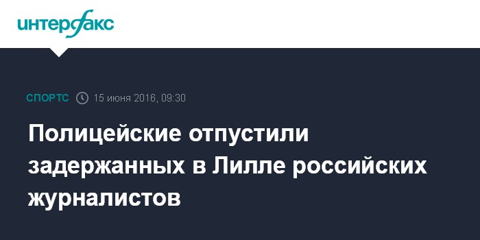 Москва. 15 июня. INTERFAX.RU - Французская полиция в городе Лилль отпустила задержанных ранее российских журналистов, которые снимали столкновение российских и английских футбольных болельщиков, сообщает в среду газета "Известия".