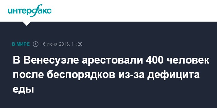 Москва. 16 июня. INTERFAX.RU - Венесуэльские военные в городе Кумана на севере страны задержали свыше 400 человек после вспышек уличного насилия и грабежей торговых точек из-за нехватки продовольствия, сообщает в четверг местное телевидение.