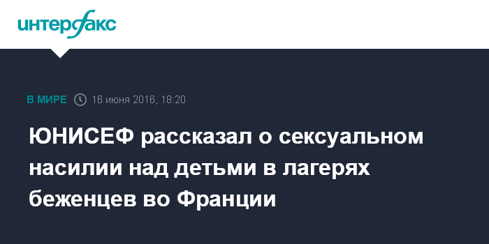Москва. 16 июня. INTERFAX.RU - Дети мигрантов, находящиеся в лагерях для беженцев на севере Франции, подвергаются сексуальному насилию и вынуждают ежедневно работать, сообщили в четверг в Детском фонде ООН (ЮНИСЕФ).