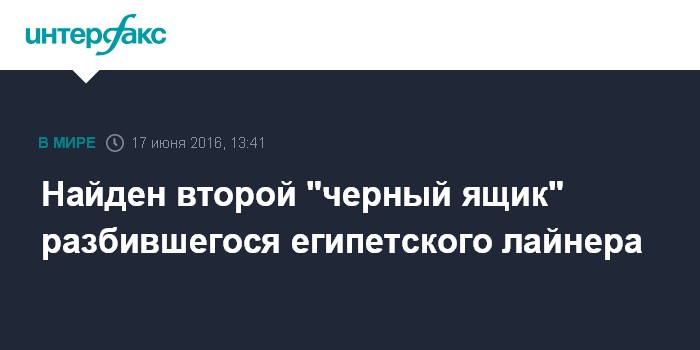 Москва. 17 июня. INTERFAX.RU - Обнаружен второй "черный ящик" самолета EgyptAir, разбившегося над Средиземным морем в мае. Об этом сообщает "Би-би-си" со ссылкой на следователей.