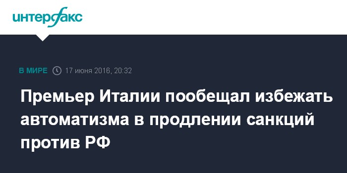 Москва. 17 июня. INTERFAX.RU - Премьер Италии Маттео Ренци заверил, что его страна на очередном заседании послов при ЕС не допустит автоматизма продления санкций против России.