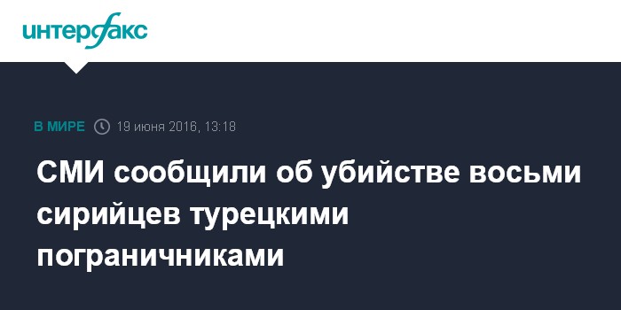 Москва. 19 июня. INTERFAX.RU - Не менее восьми беженцев из Сирии были убиты при попытке пересечь границу с Турцией, сообщило в воскресенье агентство Associated Press со ссылкой на данные правозащитников. Среди погибших - четверо детей.