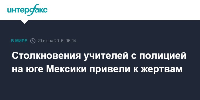 Москва. 20 июня. INTERFAX.RU - Как минимум три человека были убиты на юге Мексики в результате столкновений между протестующими учителями и полицией. Как передает BBC, Еще 45 человек, включая полицейских, получили ранения.