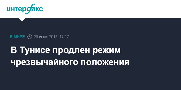 Москва. 20 июня. INTERFAX.RU - Президент Туниса принял решение еще на месяц продлить режим чрезвычайного положения, который был введен в ноябре прошлого года, когда страна пережила серию терактов.