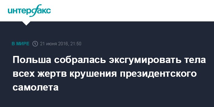 Москва. 21 июня. INTERFAX.RU - В прокуратуре Польши во вторник сообщили о намерении провести эксгумацию останков всех погибших в результате крушения самолета под Смоленском в 2010 году, пишет сайт польской "Газеты выборчей".